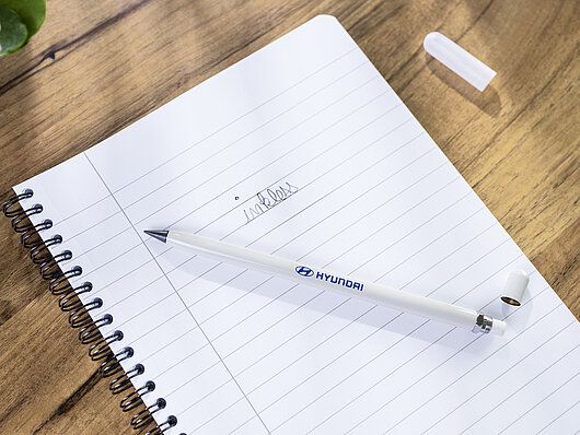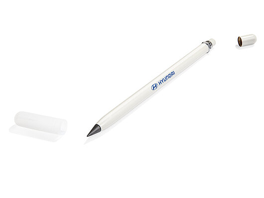Відчуйте вишукане письмо в кожній деталі. Точна, як добре заточений твердий олівець, ця тонка ручка пише сірим кольором і має приховану гумку. Коли ви пишете, крихітні цятки спеціального сплаву та графіту переносяться на папір, забезпечуючи міцне та довговічне використання. Оформлений у теплому сірому кольорі та бренді Hyundai, це вражаючий вибір для будь-якого письменника.